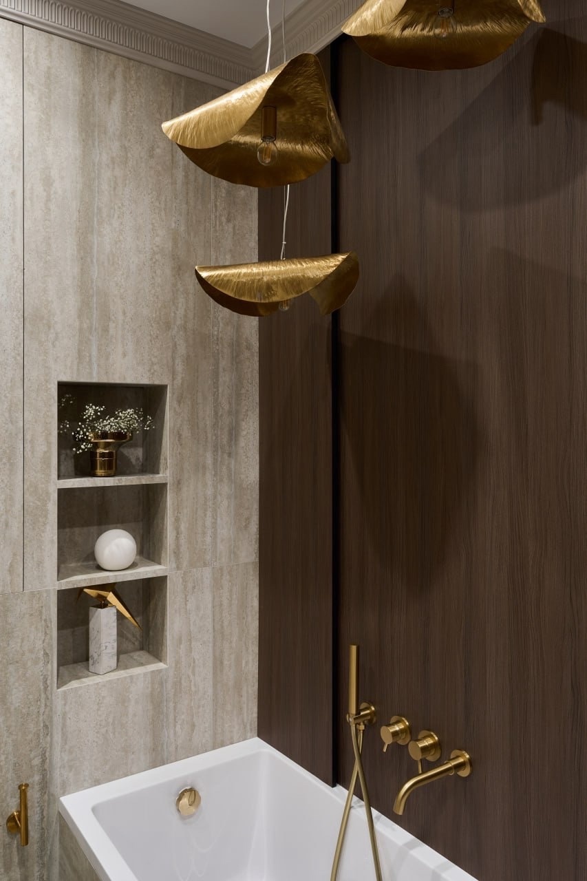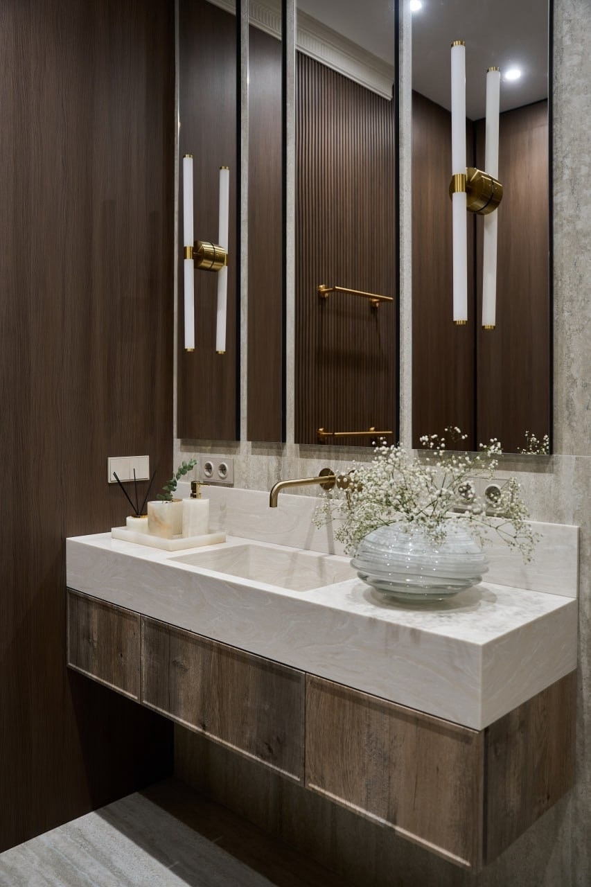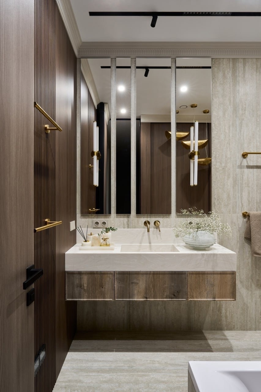 Стены в ванной комнате оформлены декоративными панелями NEO древесной серии, артикул 8041 и рифлеными панелями той же текстуры, артикул GR-18.