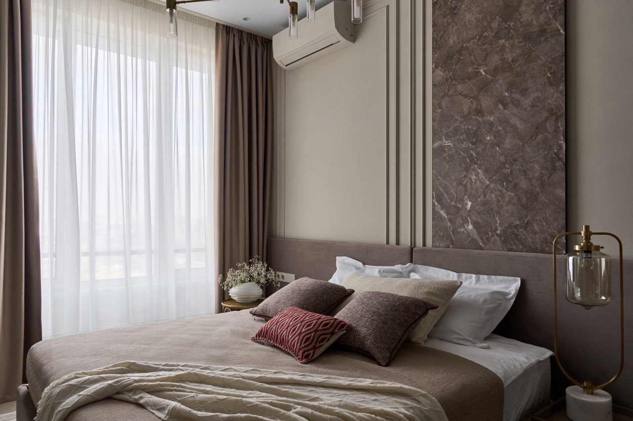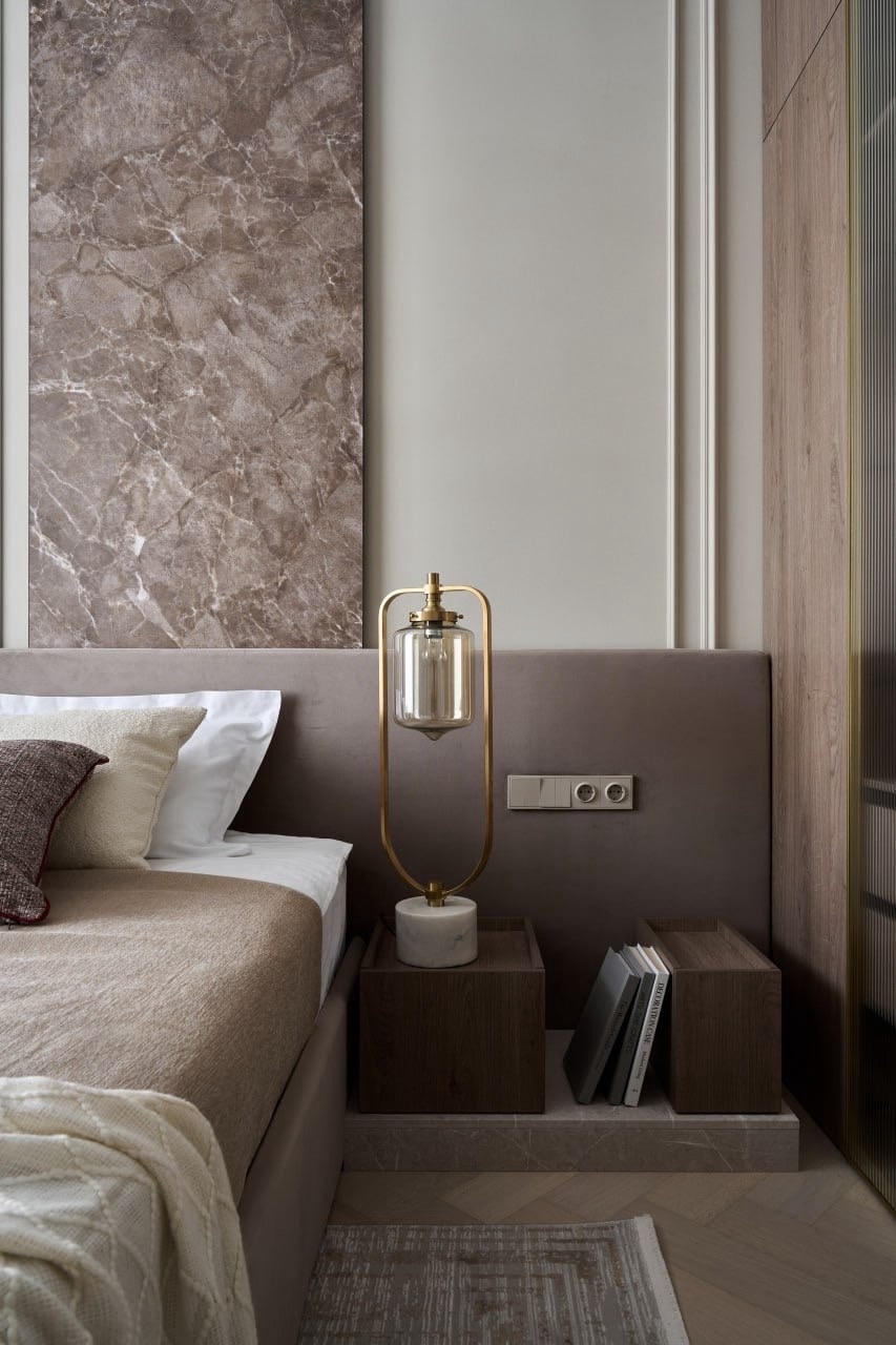 Акцентная стена в спальне оформлена декоративной панелью NEO каменной серии.