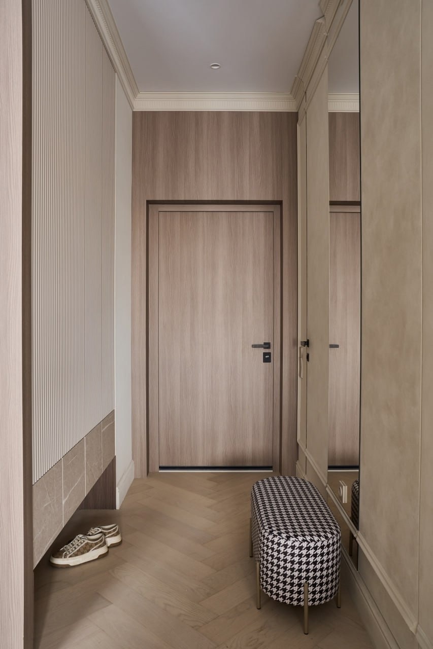 Стены в коридоре и двери invisible оформлены декоративными панелями NEO древесной серии, артикул 8041.