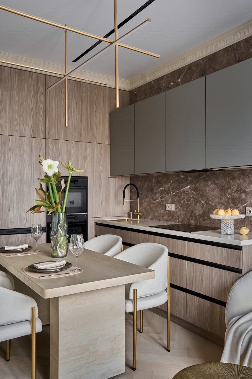 Кухонный фартук оформлен декоративной панелью NEO каменной серии, артикул 51016.