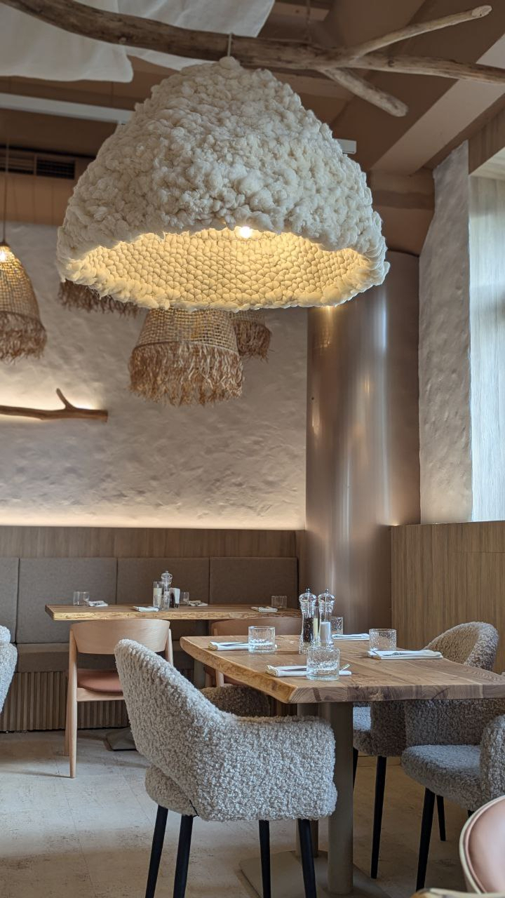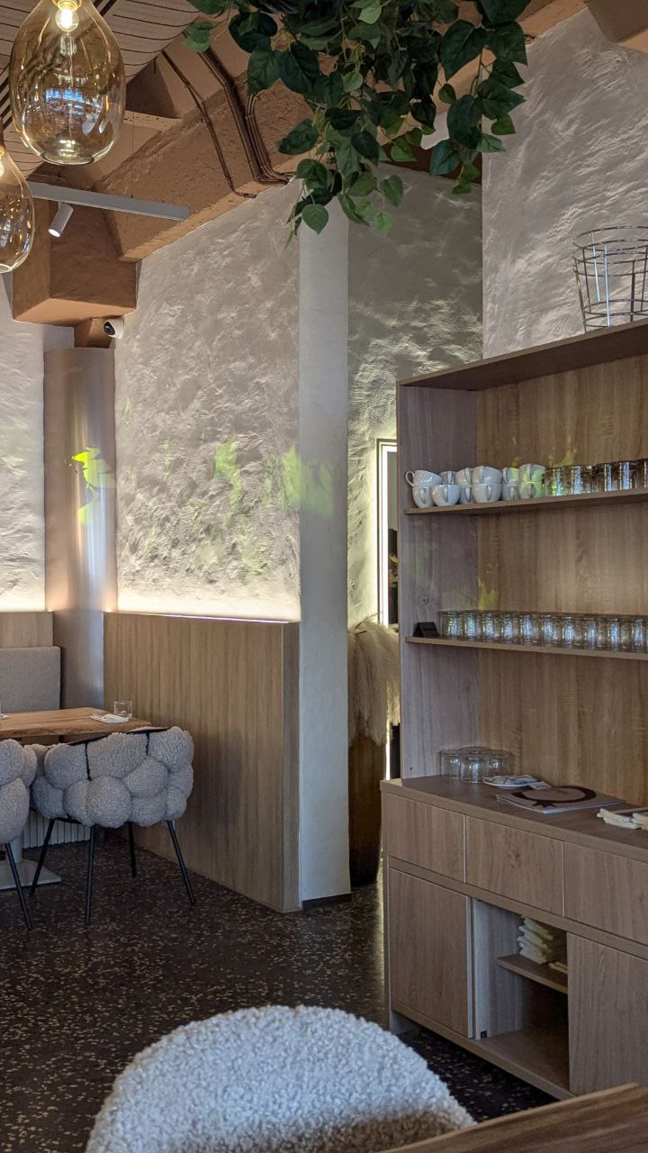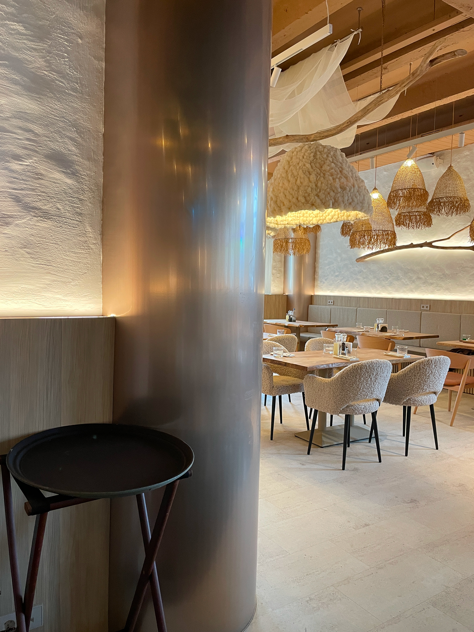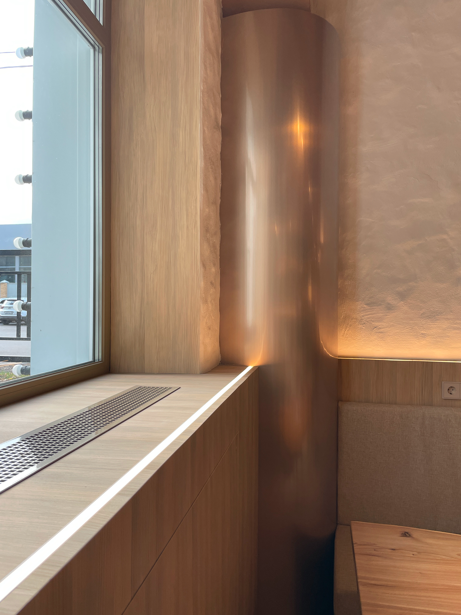 По периметру ресторана отделка стен панелями NEO древесной серии, артикул 8021 и рифлеными панелями той же текстуры.