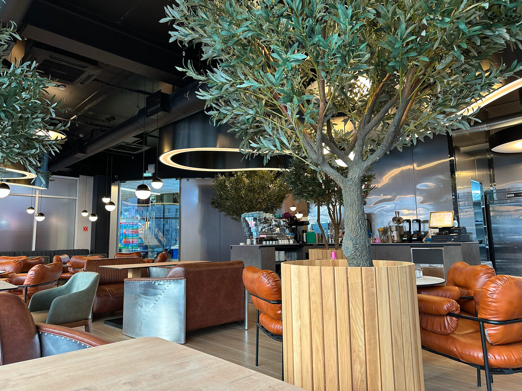 Светильники криволинейной формы на потолке сделаны с помощью декоративных панелей NEO металлической серии, артикул 702.