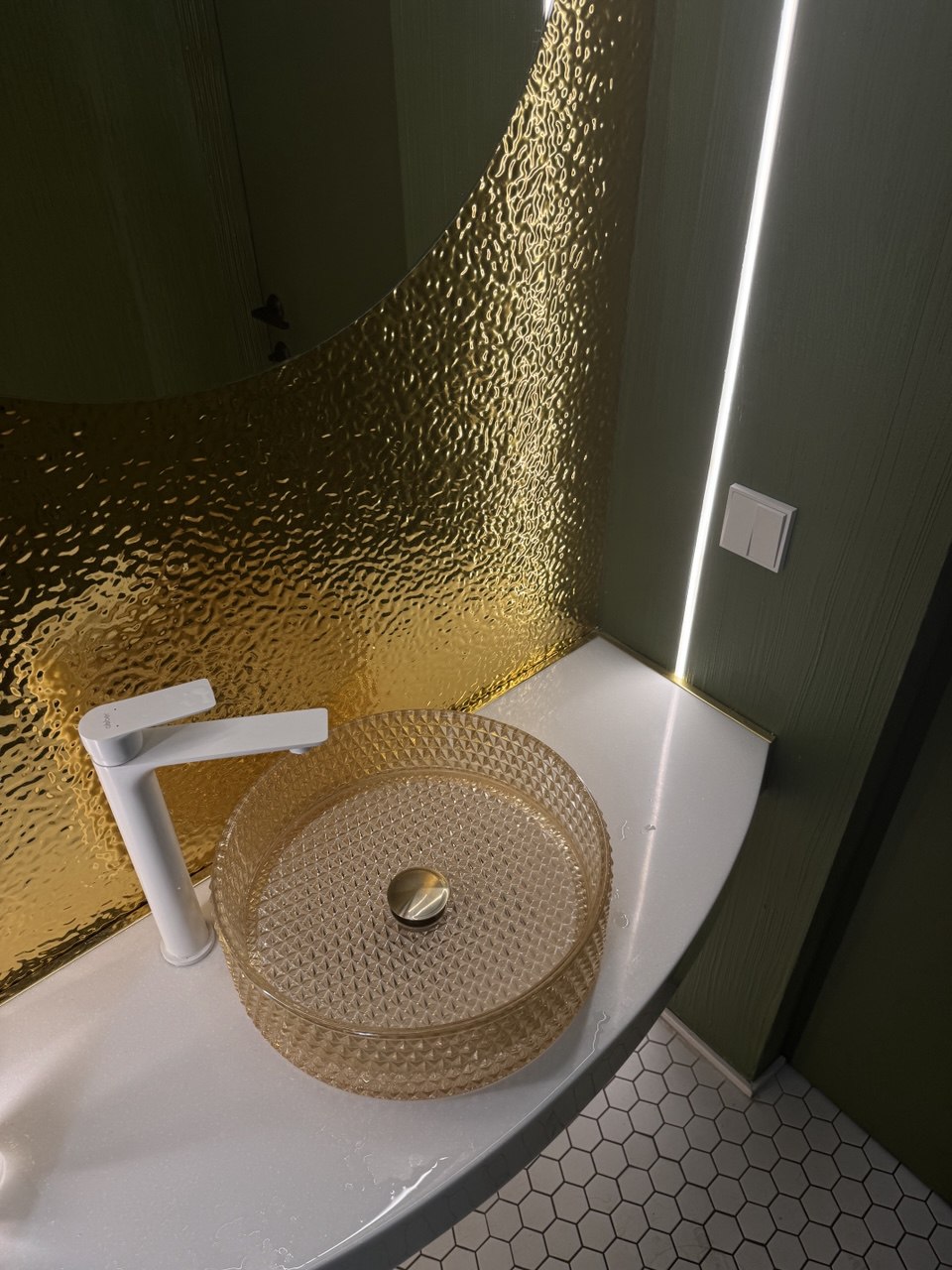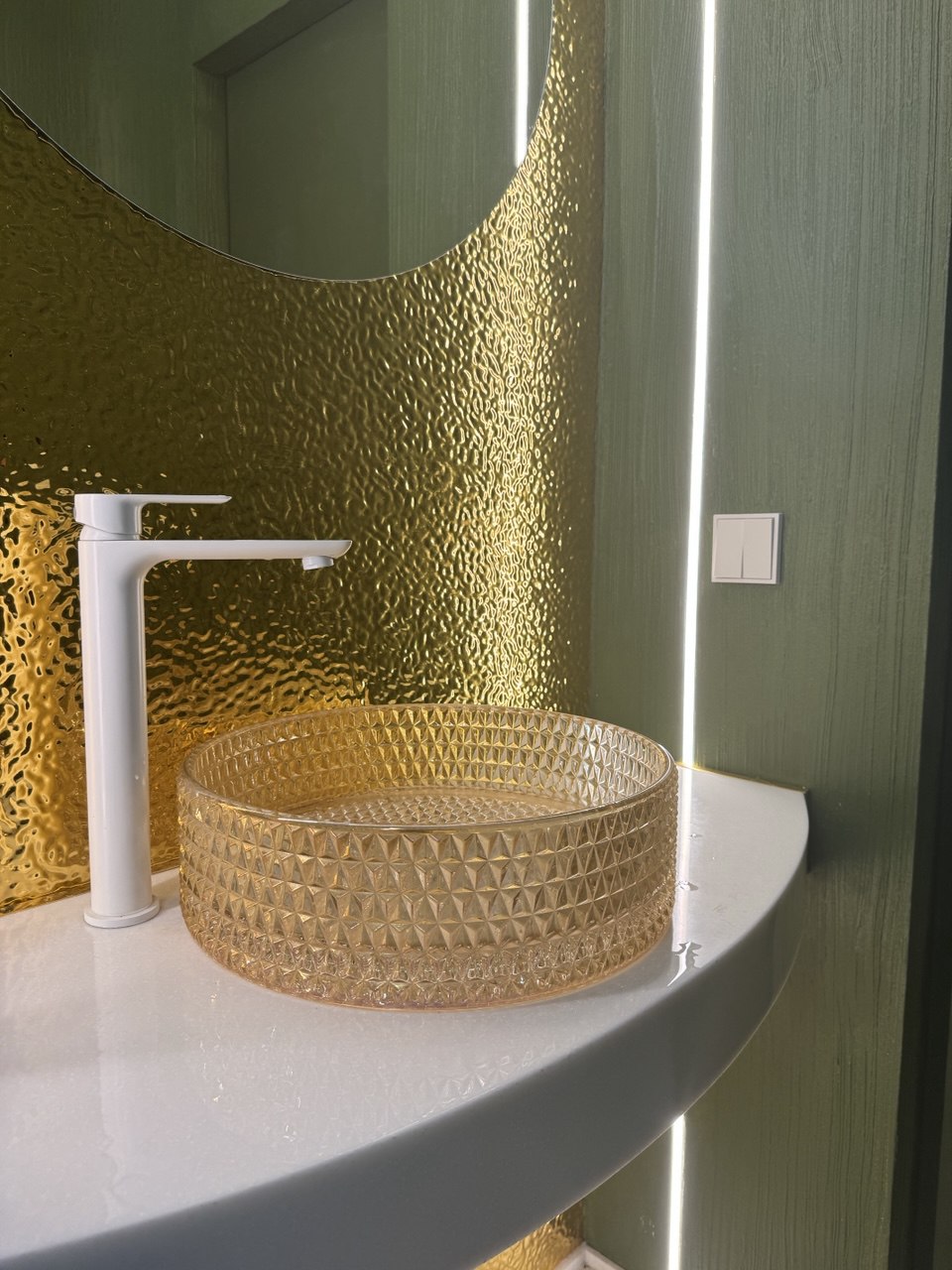 Панели НЕО металлической серии, текстура 903 - золотистая рябь на стене за зеркалом в санузле.
